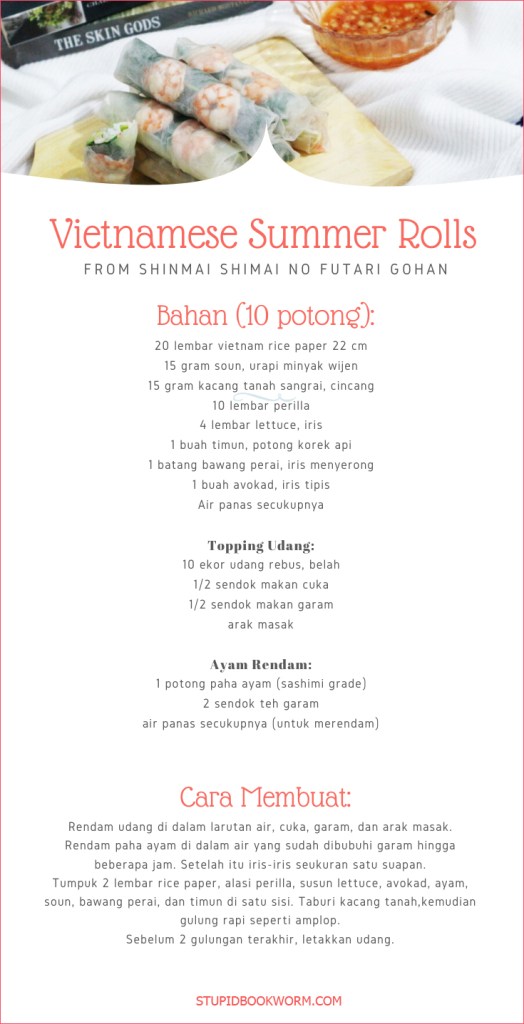 Khusus summer rolls, resepnya saya pelajari dari manga Shinmai Shimai no Futari Gohan (Two New Rice Cakes) yang sudah pernah saya ulas sebelumnya.