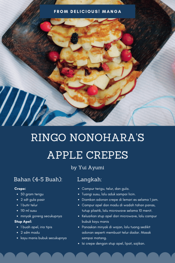 Resep yang saya praktikkan ini adalah apple crepes yang ada di Delicious! volume 4. Ini adalah resep makanan yang diajarkan Kazuomi buat program memasaknya Ringo. Penampilannya di komik seperti ini.