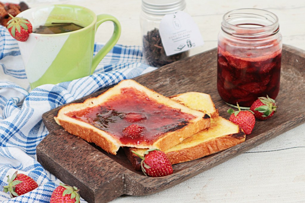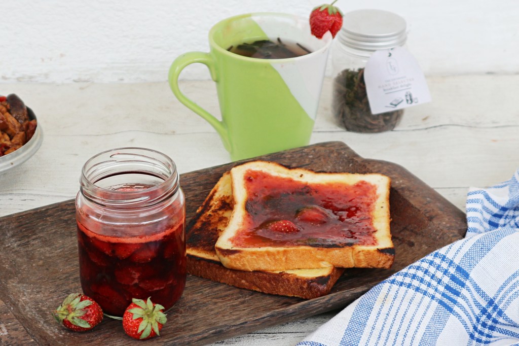 Selai stroberi yang ada potongan buahnya gini bisa buat apa? Paling gampang dijadikan olesan toast. Kalau saya sukanya dipotong kecil-kecil.