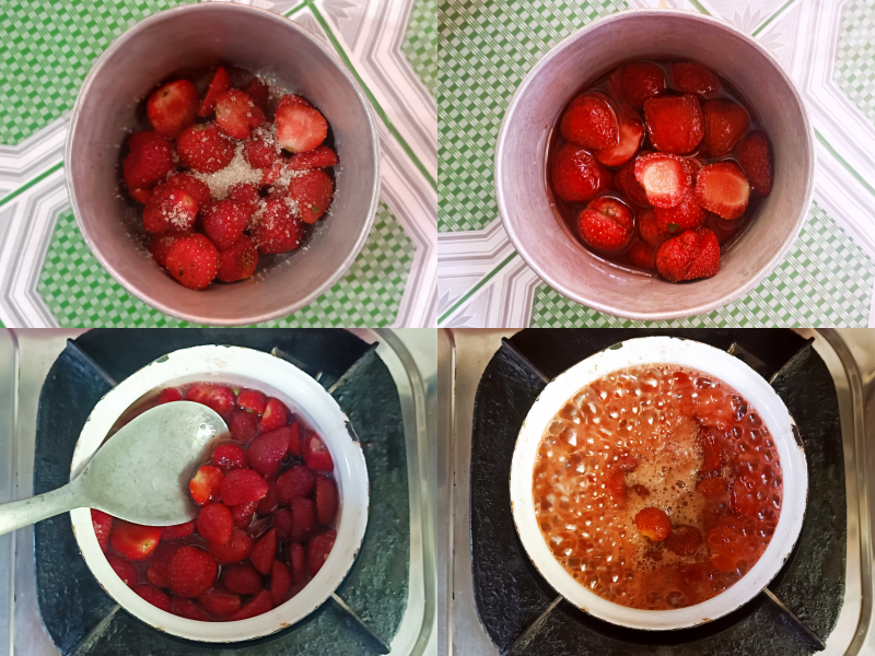 - Panaskan campuran stroberi dan gula pasir tadi di atas kompor. Pakai api kecil saja agar tidak hangus.