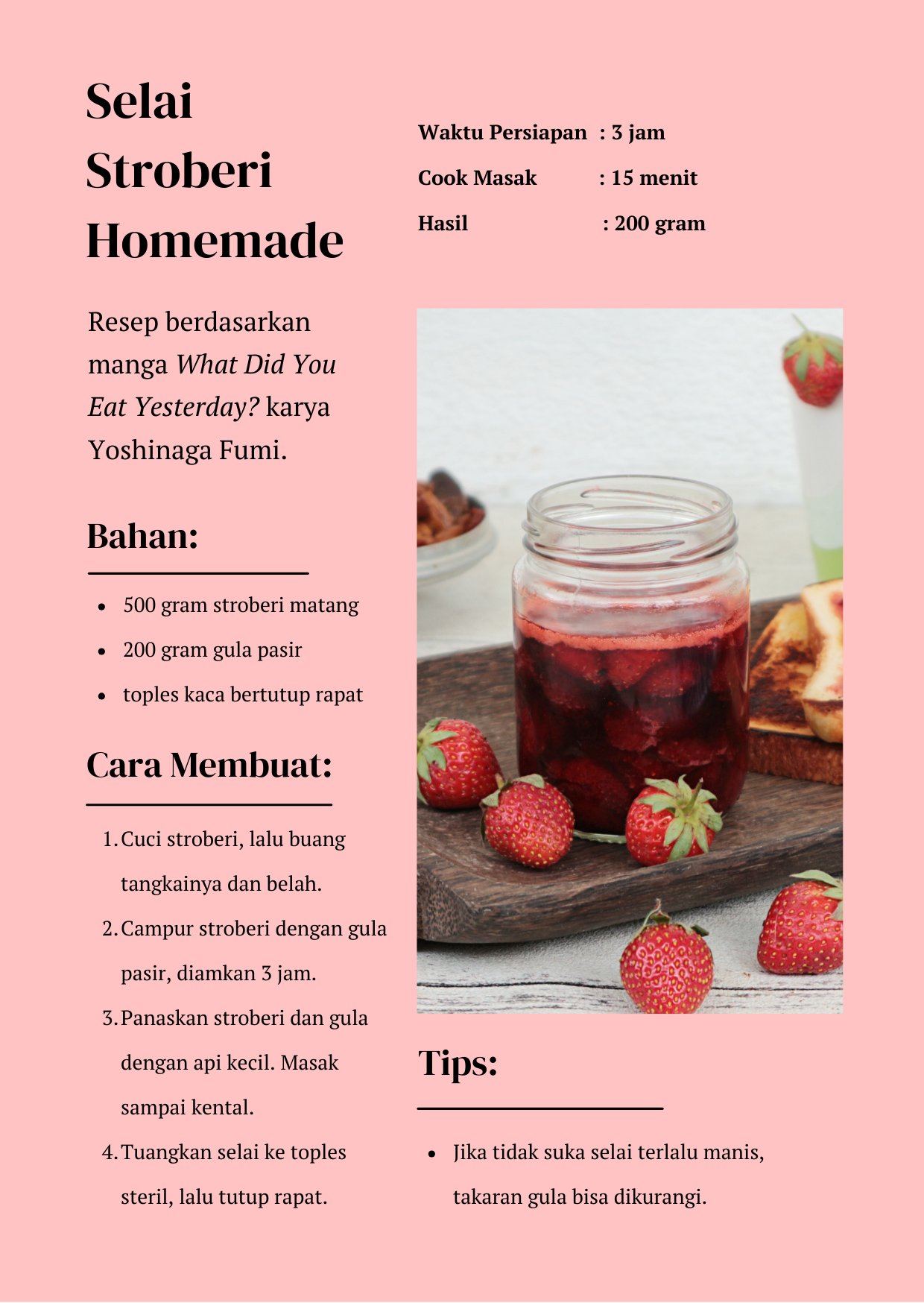 Nah, kali ini mau share resep selai stroberi homemade dari manga What Did You Eat Yesterday (Kinou Nani Tabeta?) karya Yoshinaga Fumi.