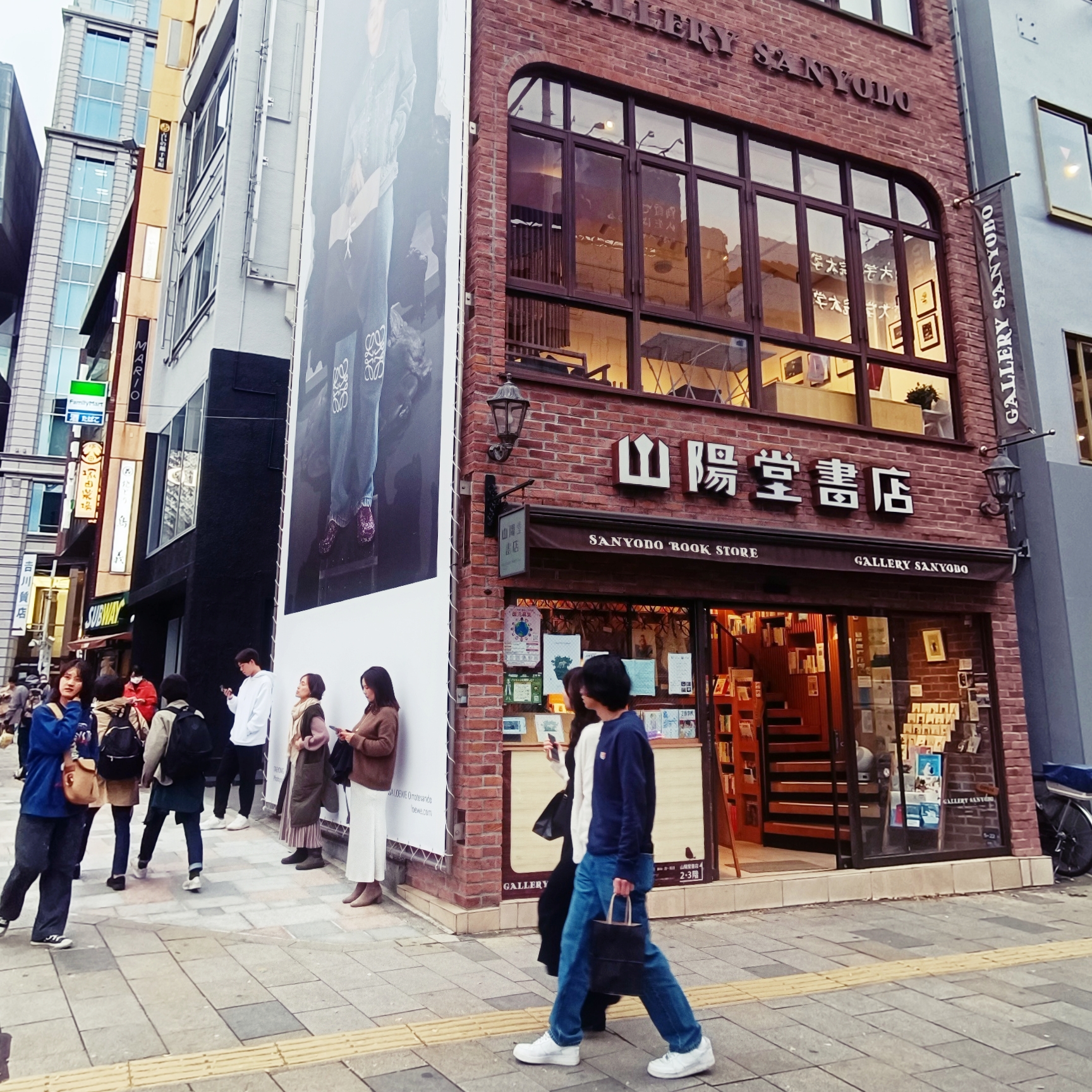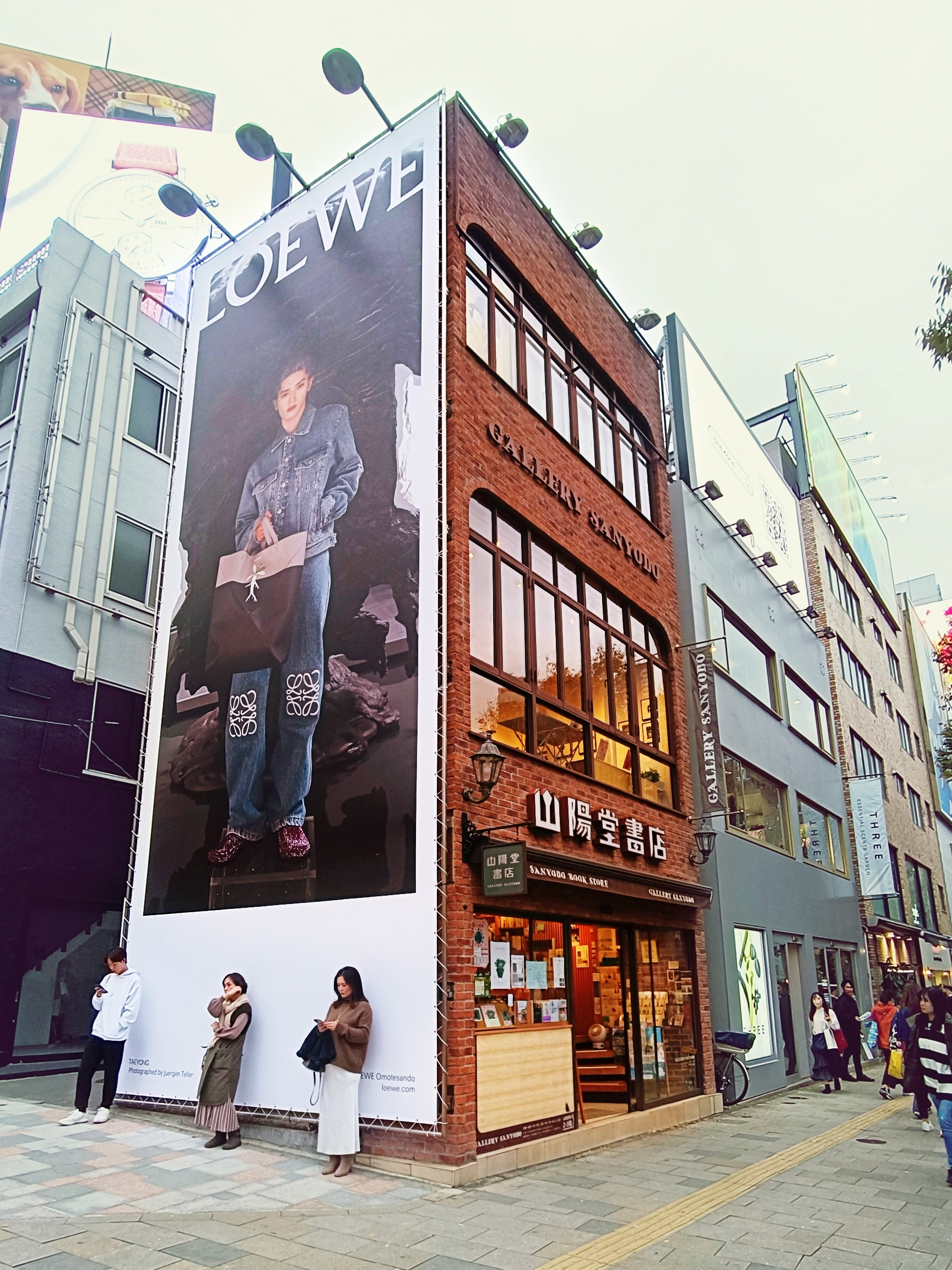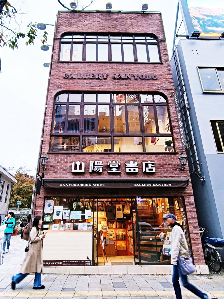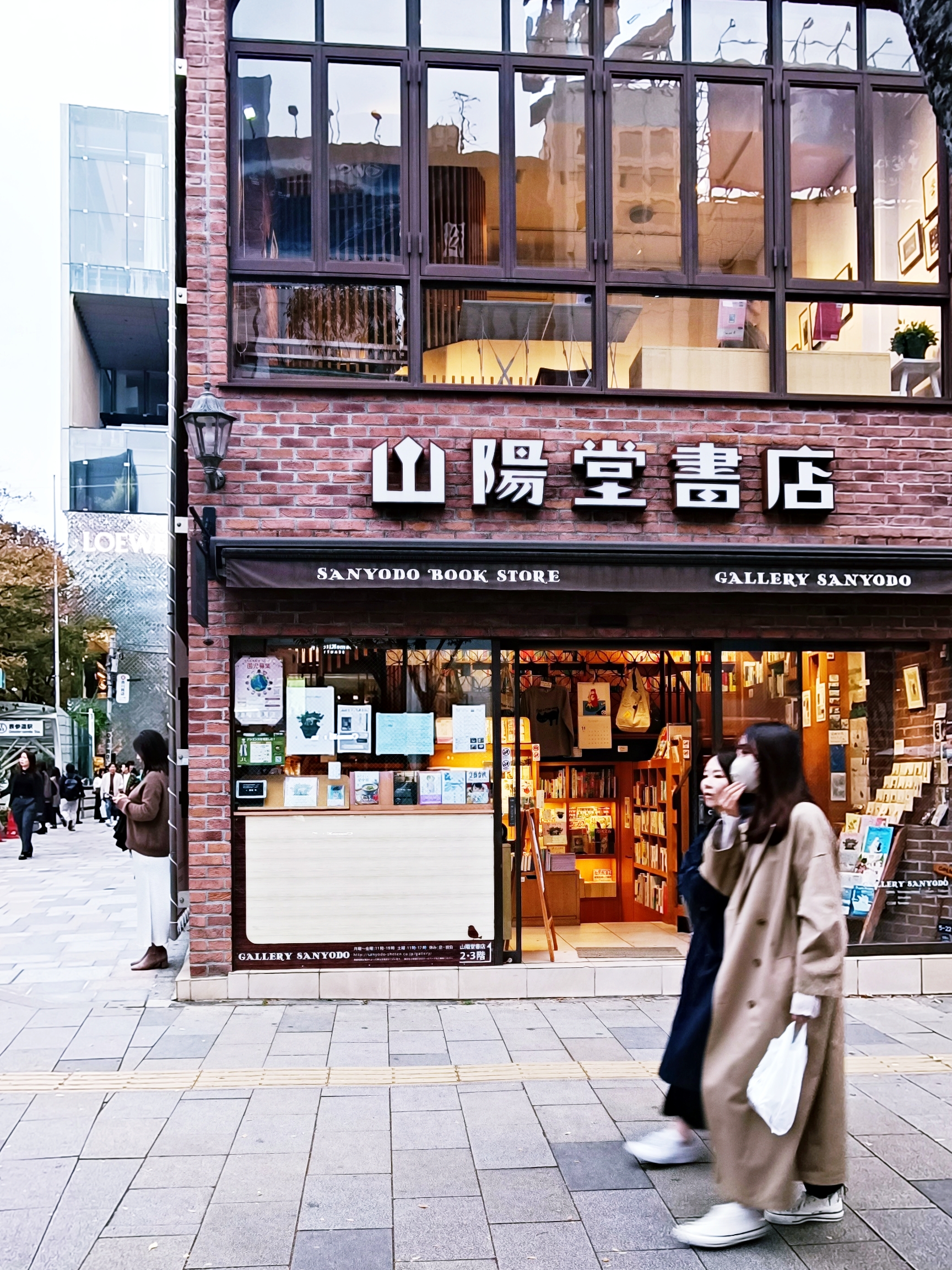 Sanyodo Shoten kelihatan mencolok berdampingan dengan gedung-gedung tinggi dan toko brand fashion yang bernuansa modern.