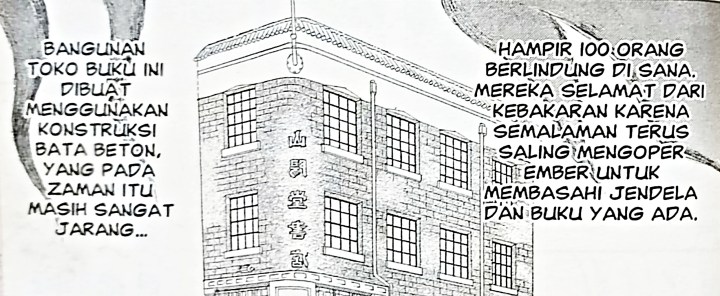Sebagian besar bangunan di sana sudah rata dengan tanah.Namun, struktur bangunan yang kokoh membuat Sanyodo Shoten selamat.