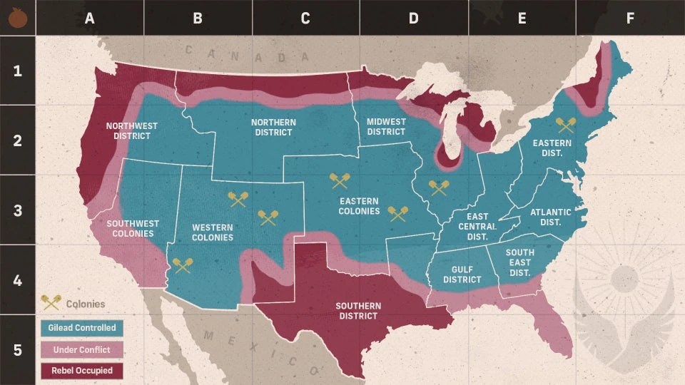 Kalau Oceania dikuasai oleh Partai yang menjunjung totalitarianisme, Sons of Jacob merebut kekuasaan dan mendirikan Republik Gilead dengan agama sebagai “senjata”.