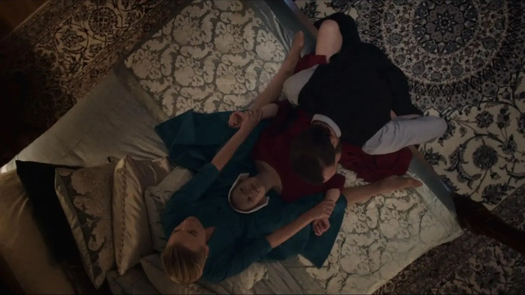 Setiap bulan pada masa subur, Offred harus berbaring di ranjang, berdoa bersama istri sang komandan sebelum sang komandan berusaha menghamilinya.