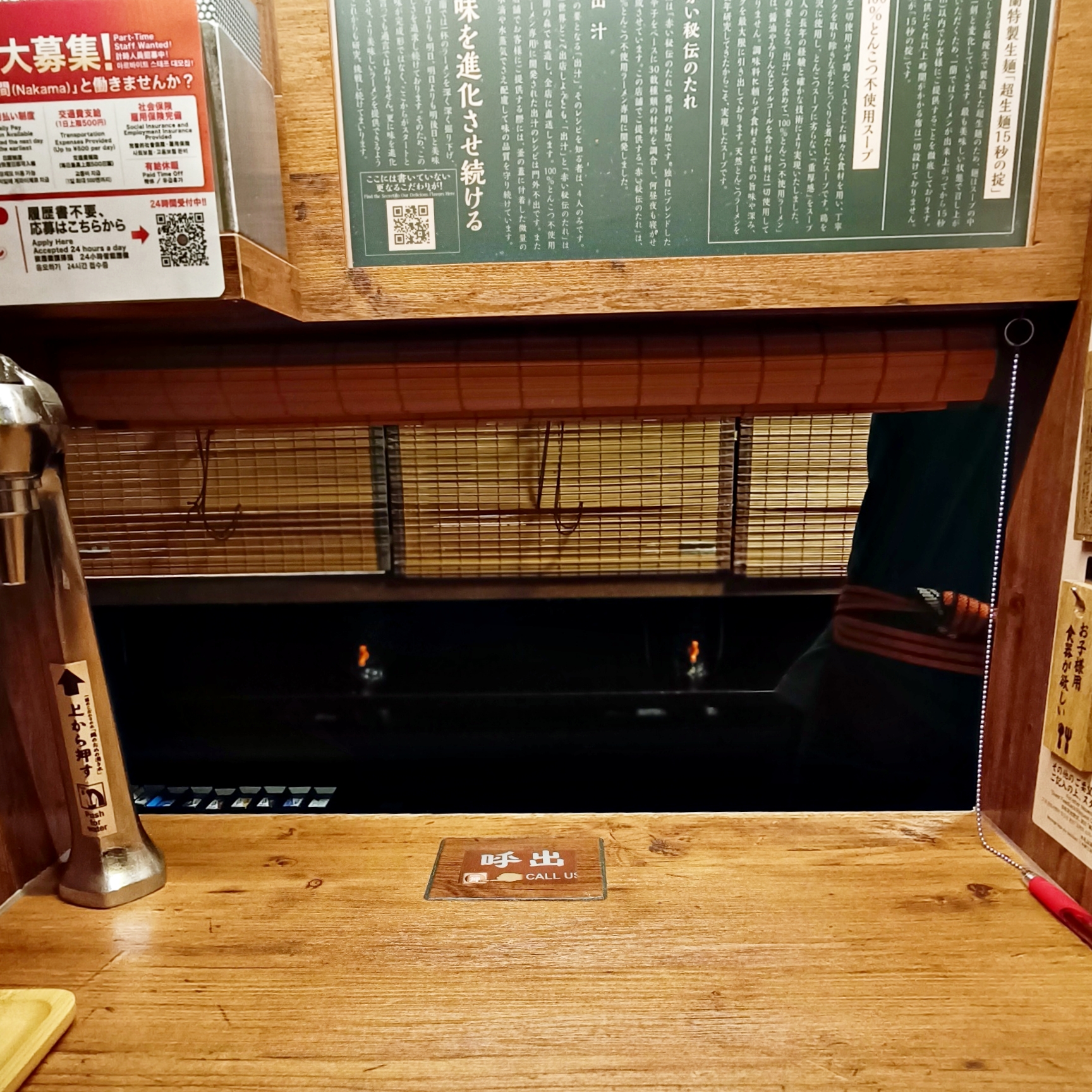 Tiap meja juga dilengkapi tirai bambu kecil untuk memudahkan staf kedai mengambil kertas pesanan dan menyiapkan makanan.