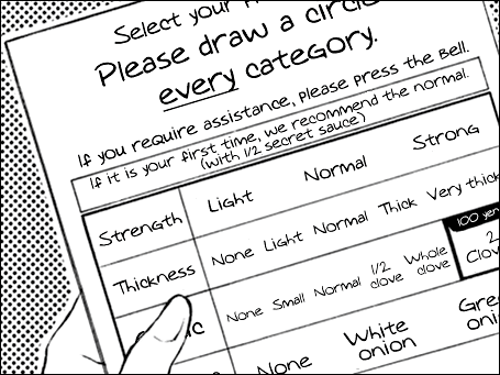 Setelah mendapat meja, pelanggan tinggal mengisi spesifikasi ramen yang diinginkan. Ada pilihan kekentalan kaldu, tingkat kegurihan, tekstur mi, level kepedasan, lauk, dan topping daun bawang.