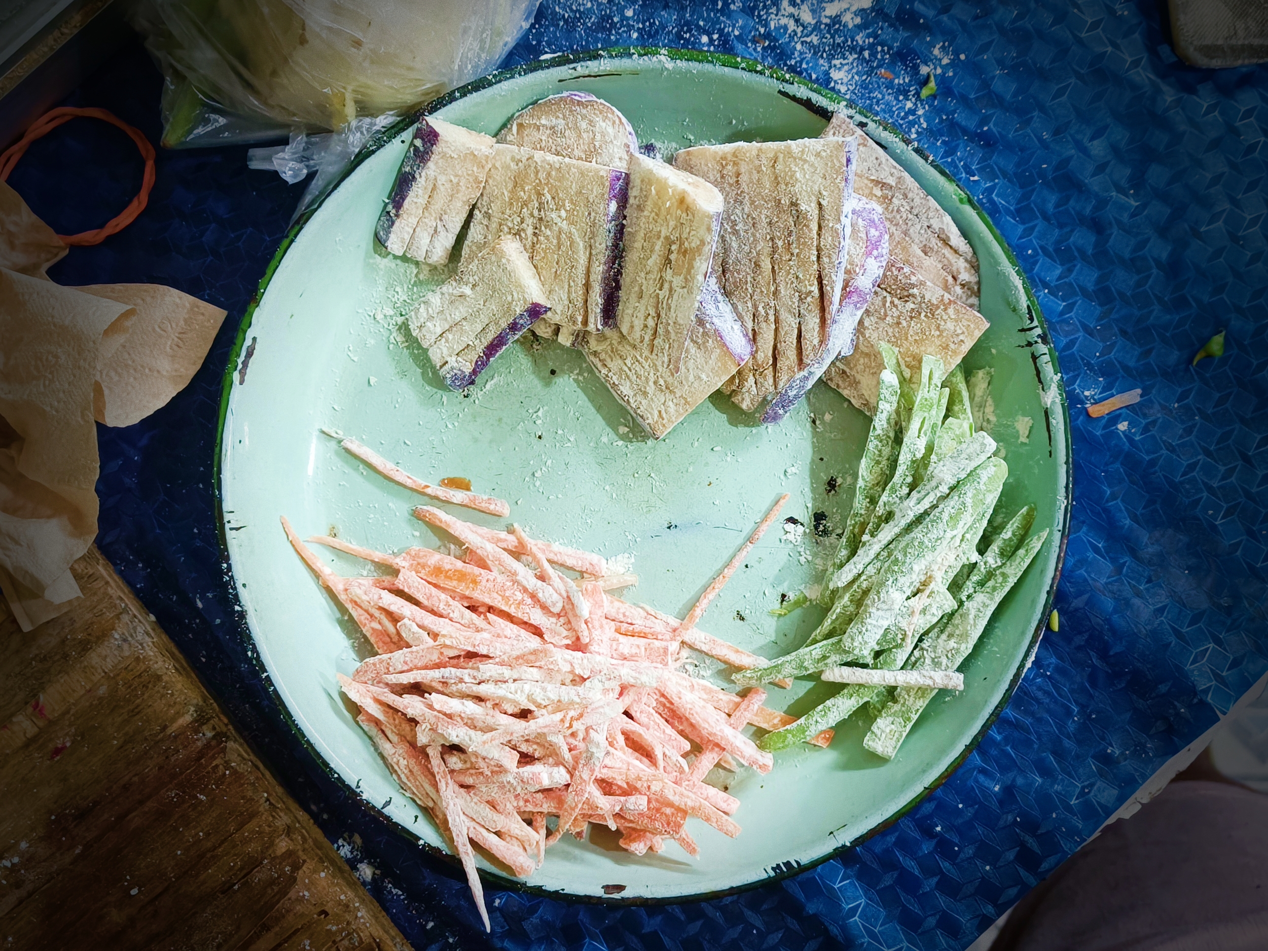 Saya coba praktik resep ini dua kali. Percobaan pertama pakai bahan yang ada di rumah. Ada yang dibentuk kakiage juga. Sayurannya tinggal dipotong-potong bentuk korek api dan dicampur adonan tepungnya. Hasilnya masih agak gosong.
